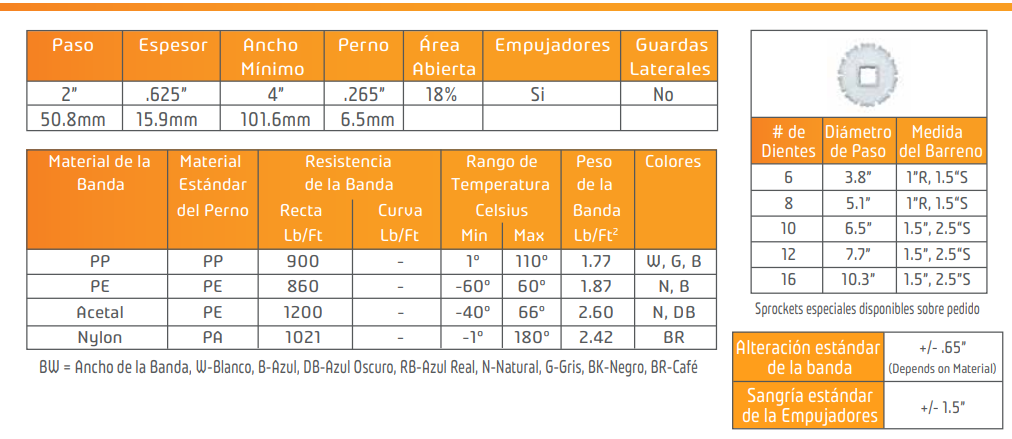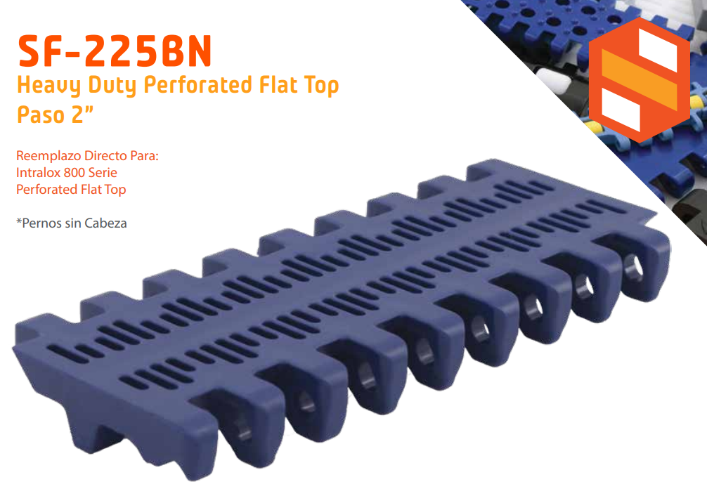 Presenta un diseño de bisagra abierta con accionamiento central, ideal para aplicaciones de contacto directo con alimentos. Las bandas de la Serie 225 son confiables para el trabajo diario en líneas de lomos, tanques de inmersión y manipulación de paquetes .