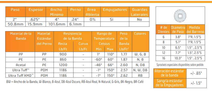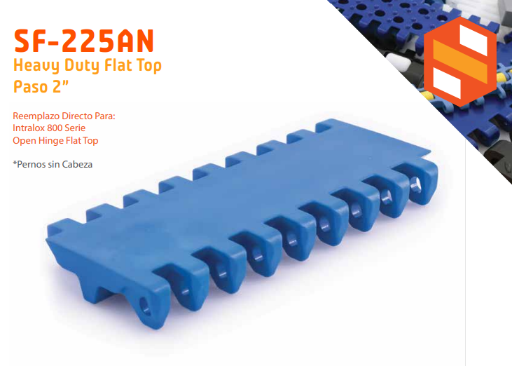 La banda modular ULTRA-TUFF SF-225AN es una banda modular industrial de paso 2,0” diseñada para trabajo pesado en líneas transportadoras que requieren resistencia al impacto, abrasión y cargas continuas. Su estructura de bisagra plana con espesor de 0,625” y área abierta 0 % proporciona soporte continuo, alta estabilidad dimensional y una vida útil superior frente a bandas modulares estándar en aplicaciones industriales exigentes.